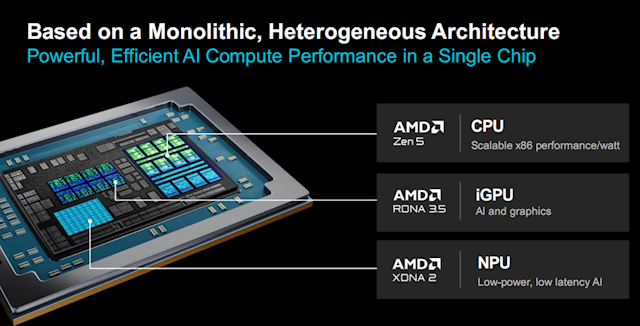 它采用了异构架构的单芯片设计,一颗芯片内,就集成了Zen 5架构的CPU x86计算引擎、RDNA 3.5架构的GPU AI与图形引擎、XDNA 2架构的NPU AI引擎,提供性能强大、能效极高的AI计算平台。