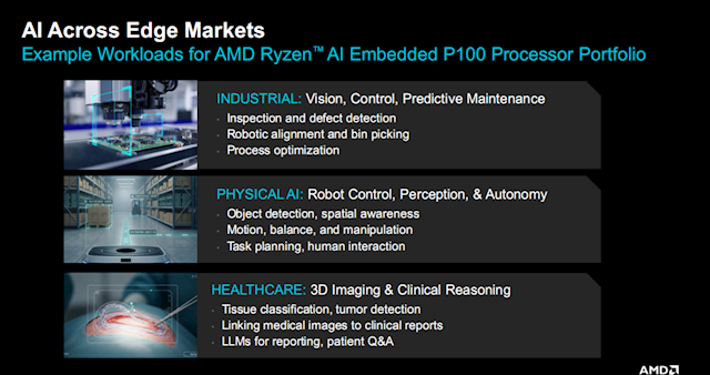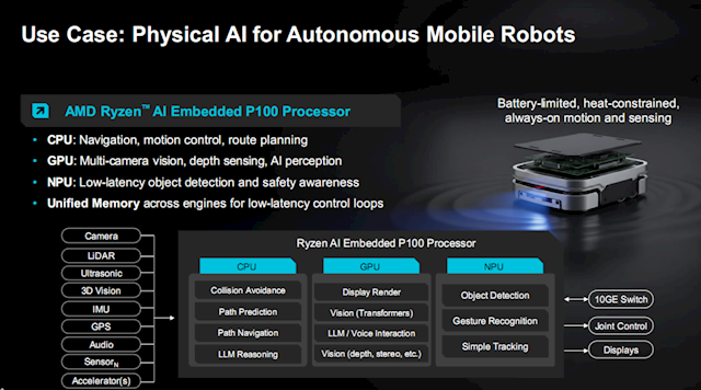 针对移动机器人,锐龙AI嵌入式P100系列可以在CPU上管理导航、运动控制与路径规划,GPU则处理多路摄像头数据,实现空间感知、视觉SLAM、视觉-语言-动作(VLA)等高级AI工作负载。