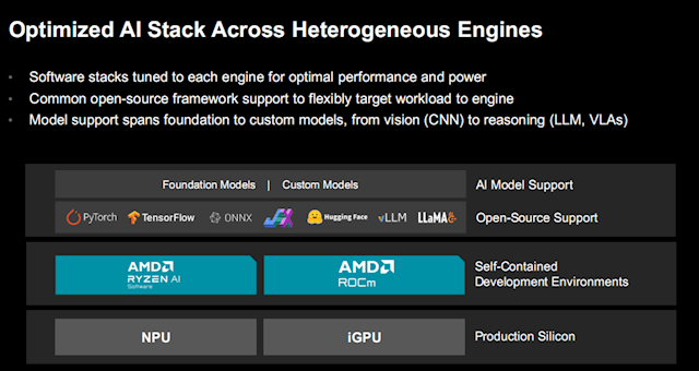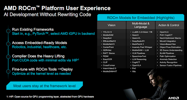 得益于AMD ROCm开放软件生态系统的支持,锐龙嵌入式处理器所运行的嵌入式应用,已经有了一整套经过广泛验证的开源AI软件栈,覆盖视觉、多模态与语言、动作与控制等各个层面。
